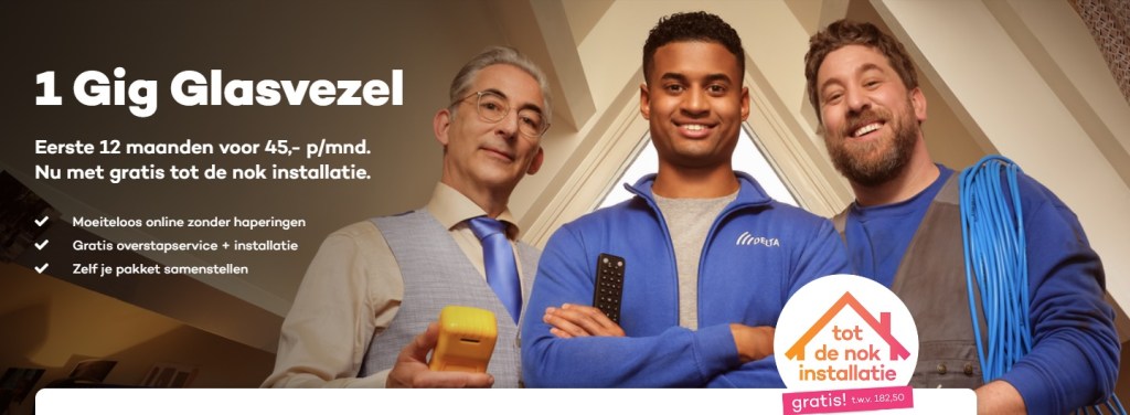 Bij DELTA ontvang je een superuitgebreide installatie tot in de nok inclusief een goed wifi netwerk op drie verdiepingen via een mesh-systeem. Daarnaast heb je al 1 Gig internet (1000 Mbps!) voor de messcherpe prijs van maar € 45 per maand. Dat is een baanbrekend scherp tarief voor dit pakket! Zo heb je dus al internet 1 Gig met ruim 50 TV-zenders voor € 57,50 per maand (na het 1e jaar € 65,00).