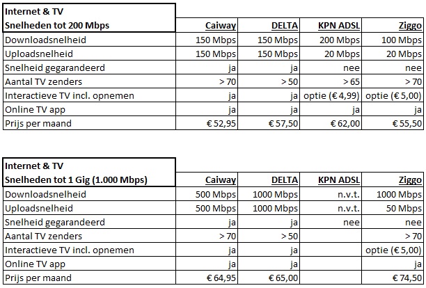 Stap je over op glasvezel? Voor de kosten hoef je het zéker niet te laten. Kijk bijvoorbeeld in onderstaande tabel de reguliere tarieven van de providers (exclusief tijdelijke actiekortingen):